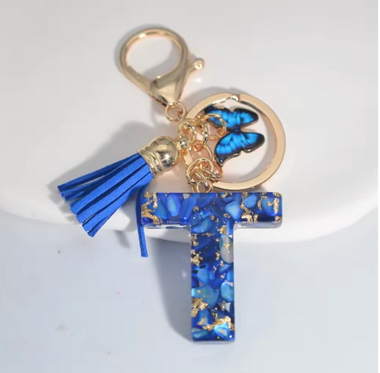Fashion Blue Glazed Stone A To Z Letter Keychain - Stylish Keychain with Blue Glaze, Gold Accents & Blue Feather Accents