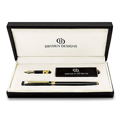 Dryden Designs Fountain Pen Set - Medium and Fine Nibs | Luxury Box, 6 Ink Cartridges - 3 Black 3 Blue, Ink Refill Converter - Intense Black