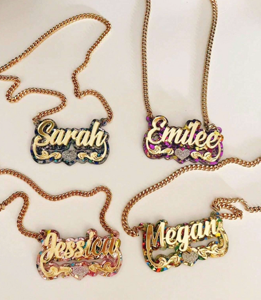 Custom Bling Acrylic Name Necklace – Personalized Glitter Heart Lace Pendant Chain, Leave The Name in The Order Instruction Please