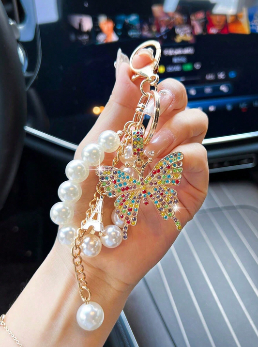 Rhinestone Butterfly Pearl Keychain – Elegant Bag & Car Charm for Women