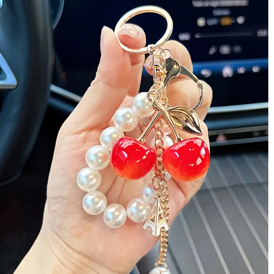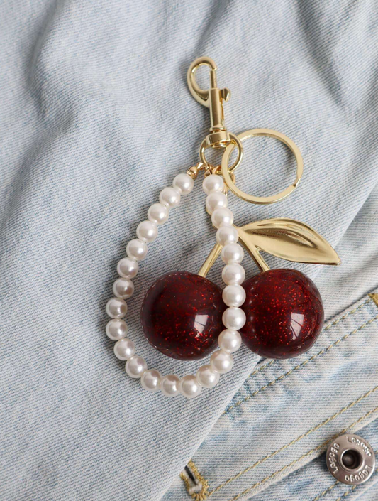 Red Glitter Cherry Pearl Keychain – Cute Bag Charm for Women, Alloy Pendant Accessory for Purse or Backpack