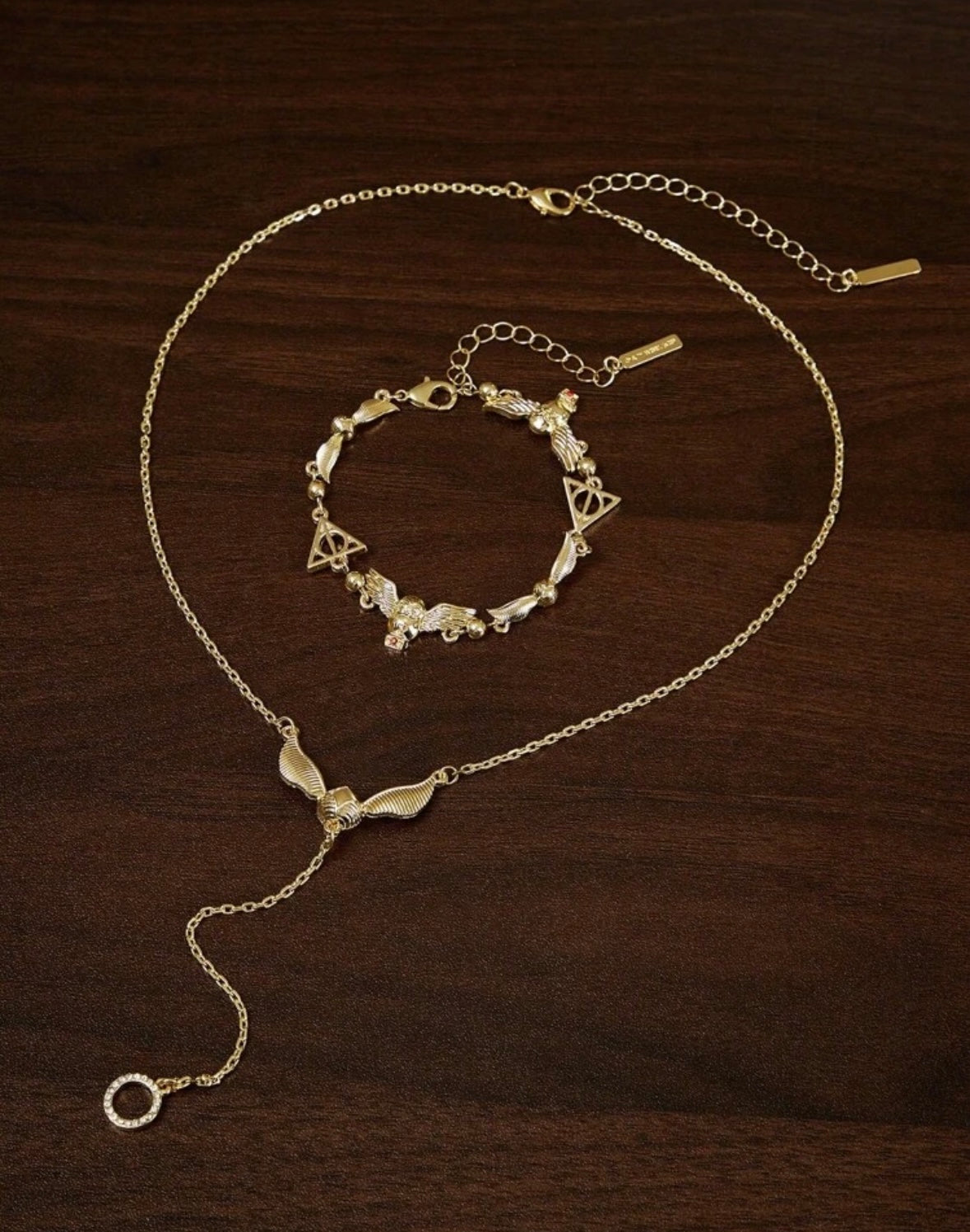 2pcs Set Adjustable Size Zinc Alloy Necklace And Bracelet Gold-Tone Gift Set, Suitable For Gifts, Collection, Memento: Golden Snitch, Deathly Hallows, Hedwig