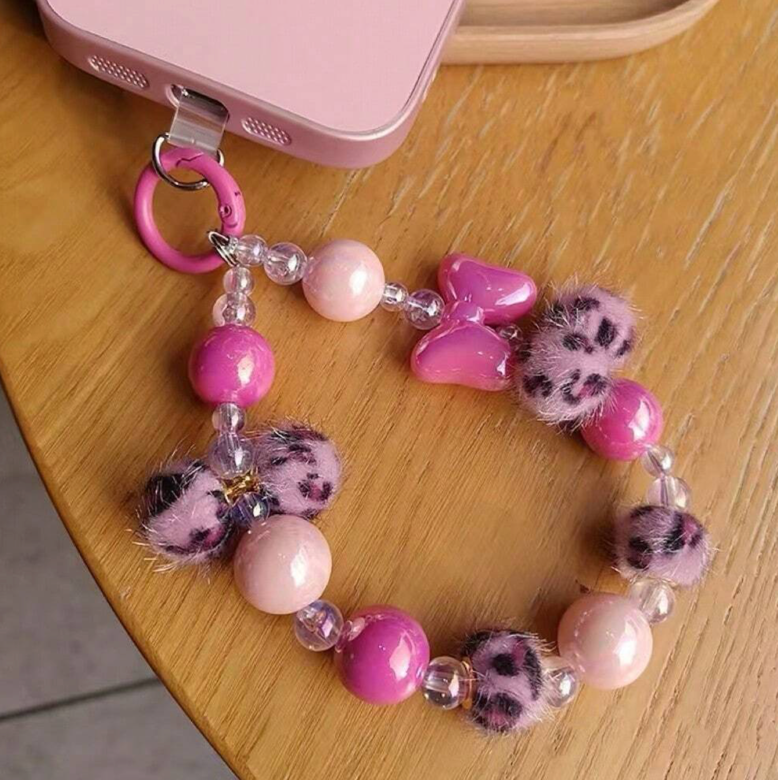 Leopard Fur Pom Pom Beaded Wrist Strap – High-End Bowknot Clip-On Lanyard for Phones, Keys & Bags